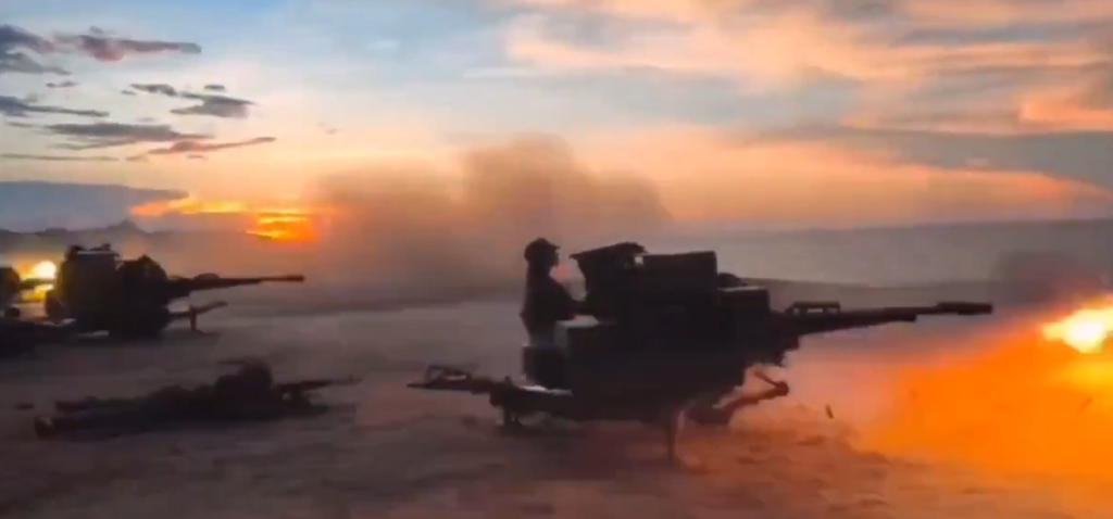 Nas imagens, é possível ver disparos de armas manuais e canhões em direção ao mar.