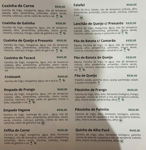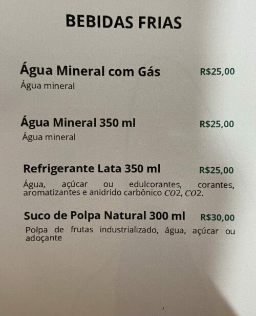 O cardápio do evento incluiu garrafa de água mineral de 350 ml a 25 reais - mesmo preço da lata de refrigerante de 350 ml -, suco de polpa natural (300 ml) a 30 reais, coxinha a 30 reais, empada de frango por 40 reais, quiche de alho poró por 40 reais e strogonoff de palmito por 60 reais, entre outros itens com valores nada atrativos.