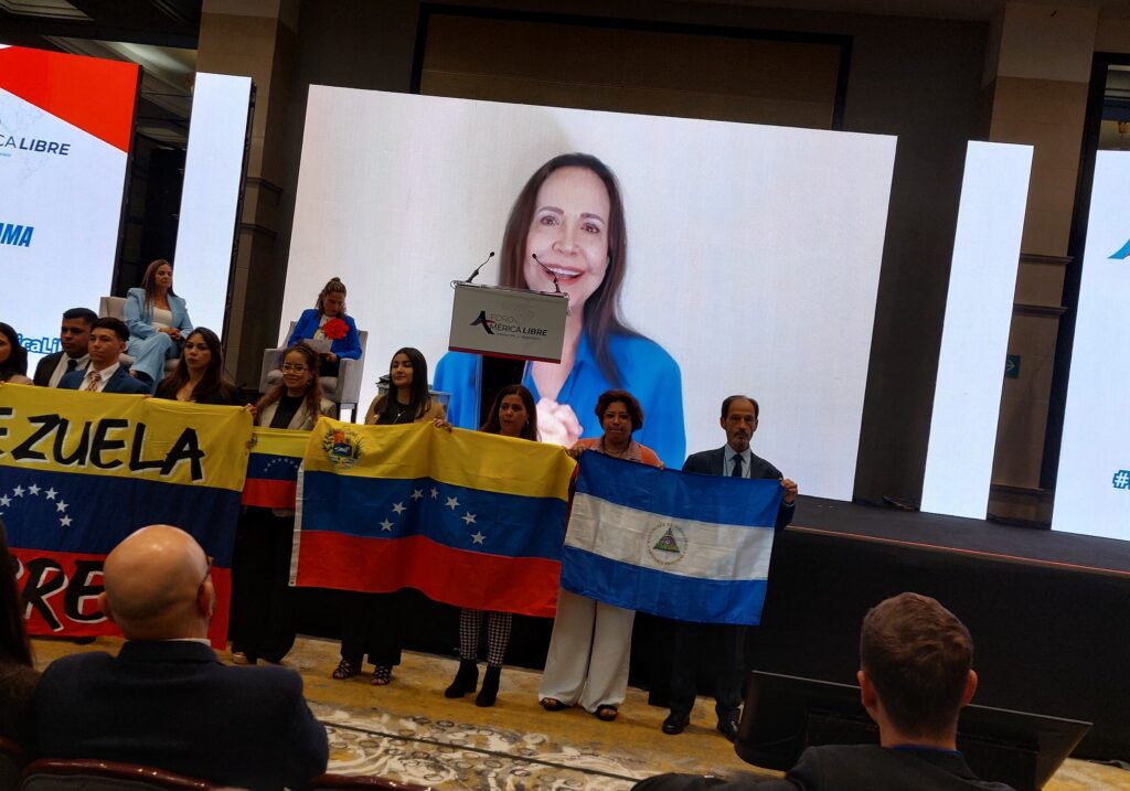 María Corina Machado, líder da oposição na Venezuela, falou de maneira remota e defendeu a liberdade dos presos políticos em vários países.