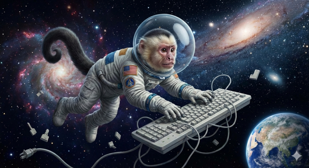 O imbróglio me lembra o “Teorema do Macaco Infinito”: em tese, um macaco digitando aleatoriamente em um teclado por um intervalo de tempo infinito irá, quase certamente, criar um texto qualquer escolhido, por exemplo, a obra completa de Shakespeare.