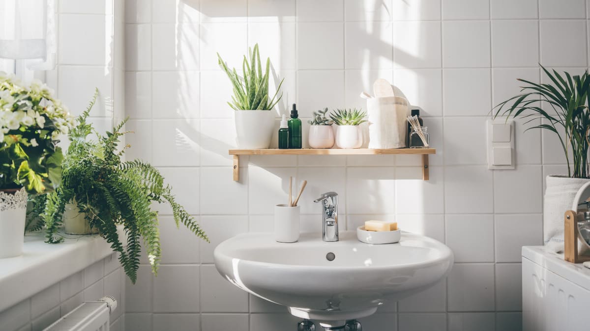 Moradores que buscam harmonia descobriram uma solução simples para criar um banheiro mais equilibrado e sereno, o cultivo do lírio-da-paz.