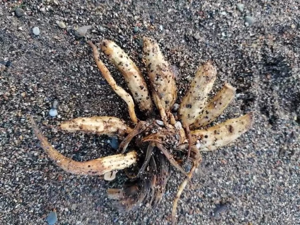A cicuta aquática costuma crescer em áreas úmidas, como margens de rios e pântanos. No entanto, tempestades recentes e marés intensas podem ter deslocado partes da planta até a faixa de areia.