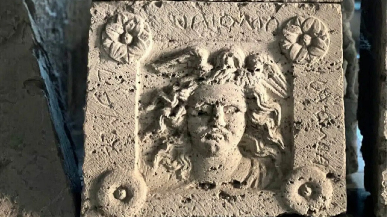 Arqueólogos da equipe do Instituto de Pesquisas Arqueológicas revelaram, durante uma escavação rotineira, uma urna funerária de travertino do século 3 a.C., adornada com uma impressionante cabeça de Medusa.