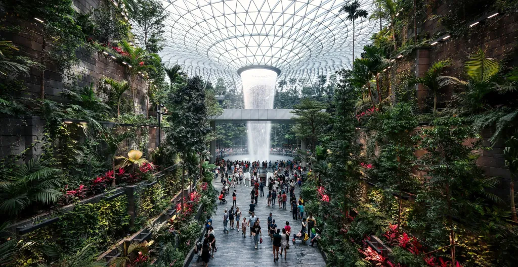 Com um shopping, museu, jardim de borboletas, piscina na cobertura e a maior cachoeira interna do mundo, a Rain Vortex, o aeroporto não é apenas um local de trânsito, mas um destino.