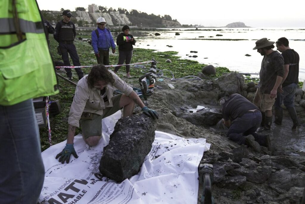 Durante as marés baixas, os cientistas avançaram nas escavações, protegendo os fósseis retirados da água e areia. A operação coordenada foi fundamental para garantir que o esqueleto fosse preservado em boas condições para futuros estudos.