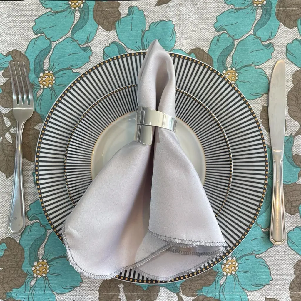 A versatilidade dos guardanapos de cetim metálico torna-os uma escolha prática para diversas opções decorativas. Em mesas discretas, eles proporcionam um ponto de destaque.