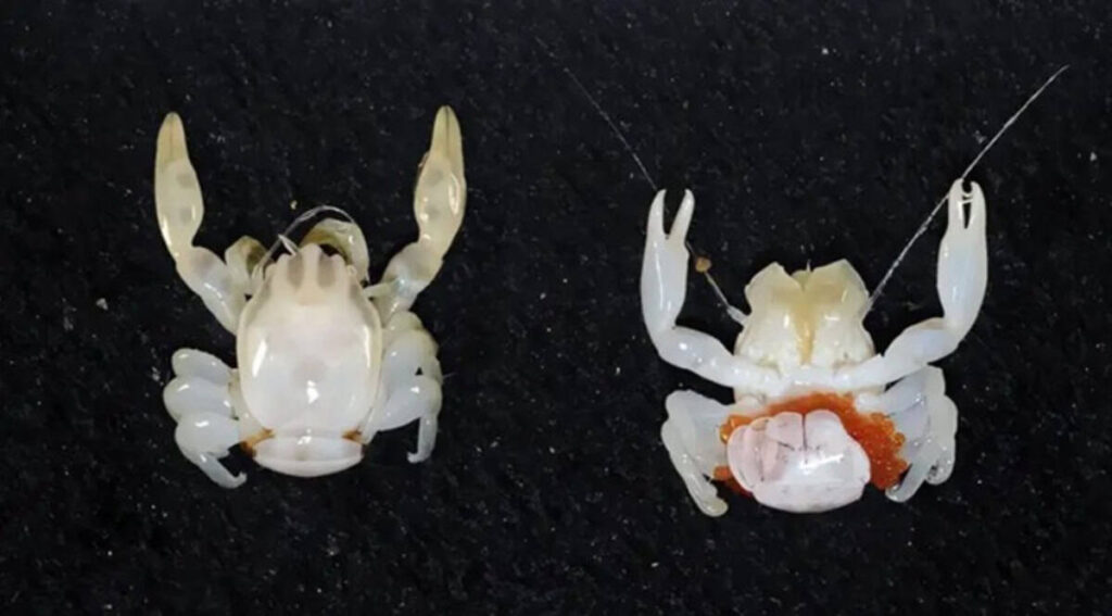 Outra descoberta significativa foi de um caranguejo quase invisível devido à sua transparência. Esse crustáceo, medindo cerca de 1,5 centímetros, foi encontrado a 122 metros de profundidade.