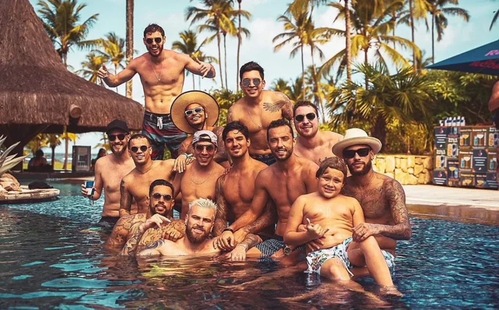 O destino foi palco de encontros animados ao lado de amigos famosos, como o surfista Gabriel Medina e o jogador Lucas Lima, reforçando o status da região como um dos refúgios mais desejados do litoral brasileiro.