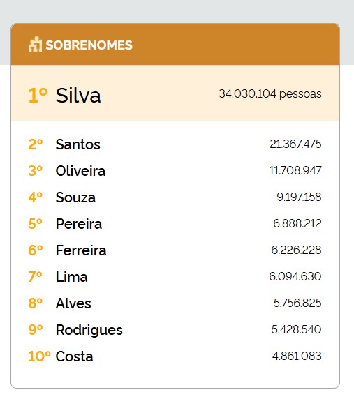 O Instituto Brasileiro de Geografia e Estatística (IBGE) divulgou pela primeira vez o ranking oficial dos sobrenomes mais populares do Brasil.