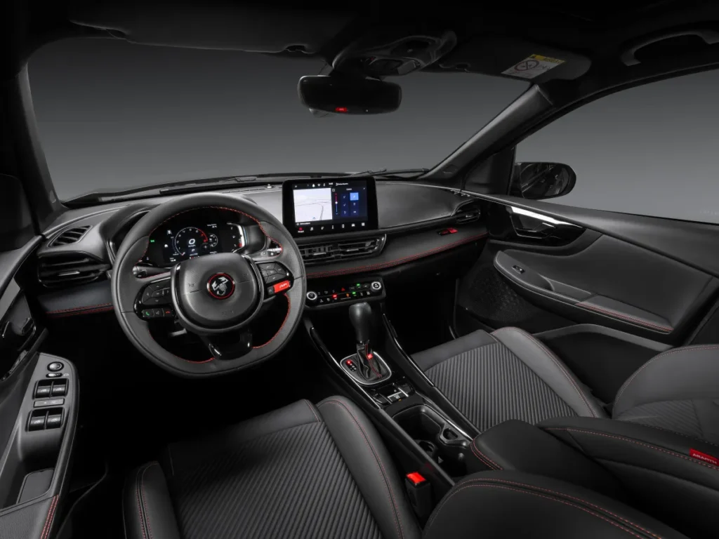 Internamente, o carro mantém uma atmosfera temática, com acabamento em vinil, costuras pretas e bancos bordados com o logotipo da série.