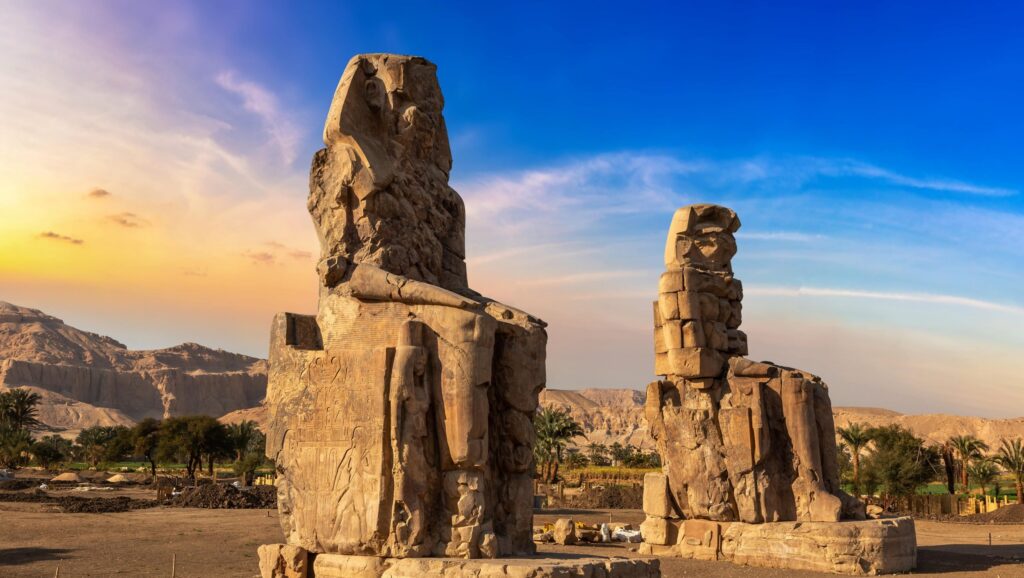 As estátuas gigantescas encontradas nas proximidades, conhecidas como os Colossos de Mémnon, permanecem de pé, desafiando o desgaste do tempo e as inundações anuais do rio Nilo. Essas figuras atraem visitantes de todo o mundo e são testemunhos do poder e da influência de Amenhotep III.